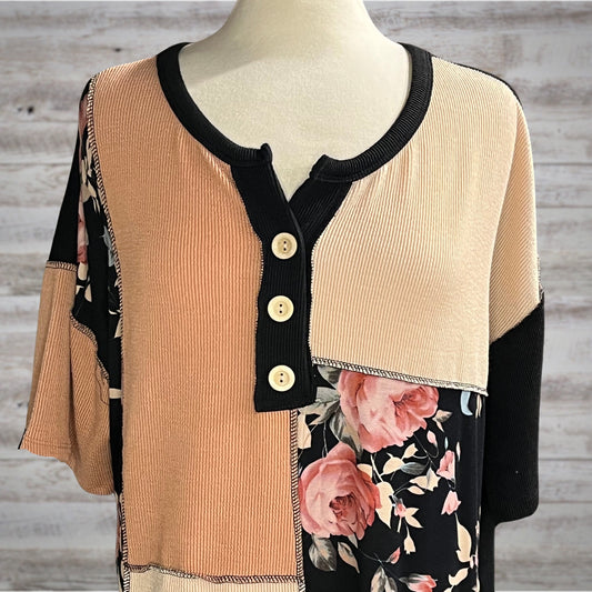 PLUS Rose Print Patchwork Ribbed Henley Tee