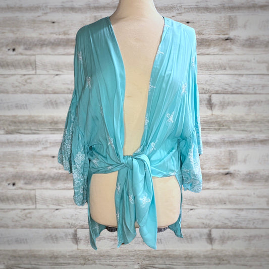 Embroidered Trumpet Sleeve Open Kimono Top in Aqua