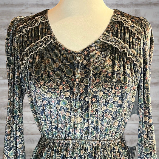 Shimmery Velvet Western Floral Long Sleeve Mini Dress in Blue