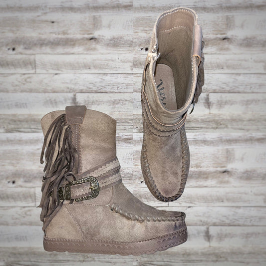 Very G Western Fringe Moc Toe Wedge Booties in Taupe Suede