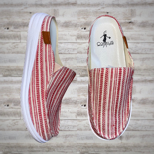 Corky’s Pontoon Red Stripe Canvas Slip On Mule Boat Shoes