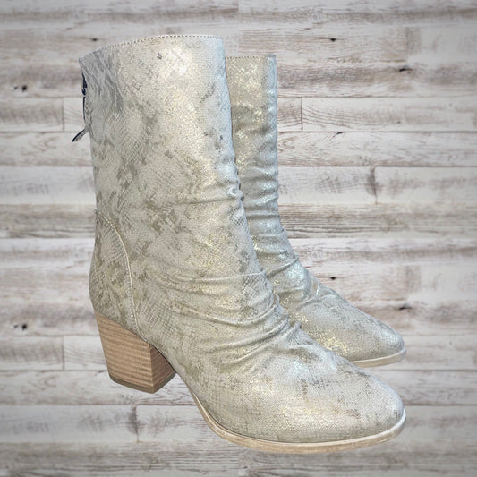 Very G Platinum Snakeskin Block Heel Mid Calf Booties