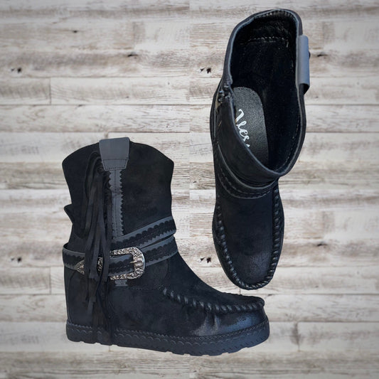 Very G Western Fringe Moc Toe Wedge Booties in Black Suede