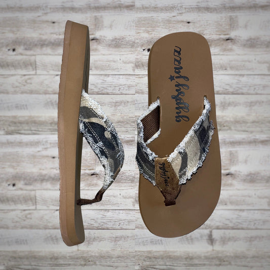 Gypsy Jazz Fringe Flatform Flip Flop Sandals in Camo