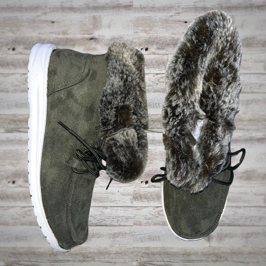 Gypsy Jazz Fur Lined Lace Up Booties in Solid Olive
