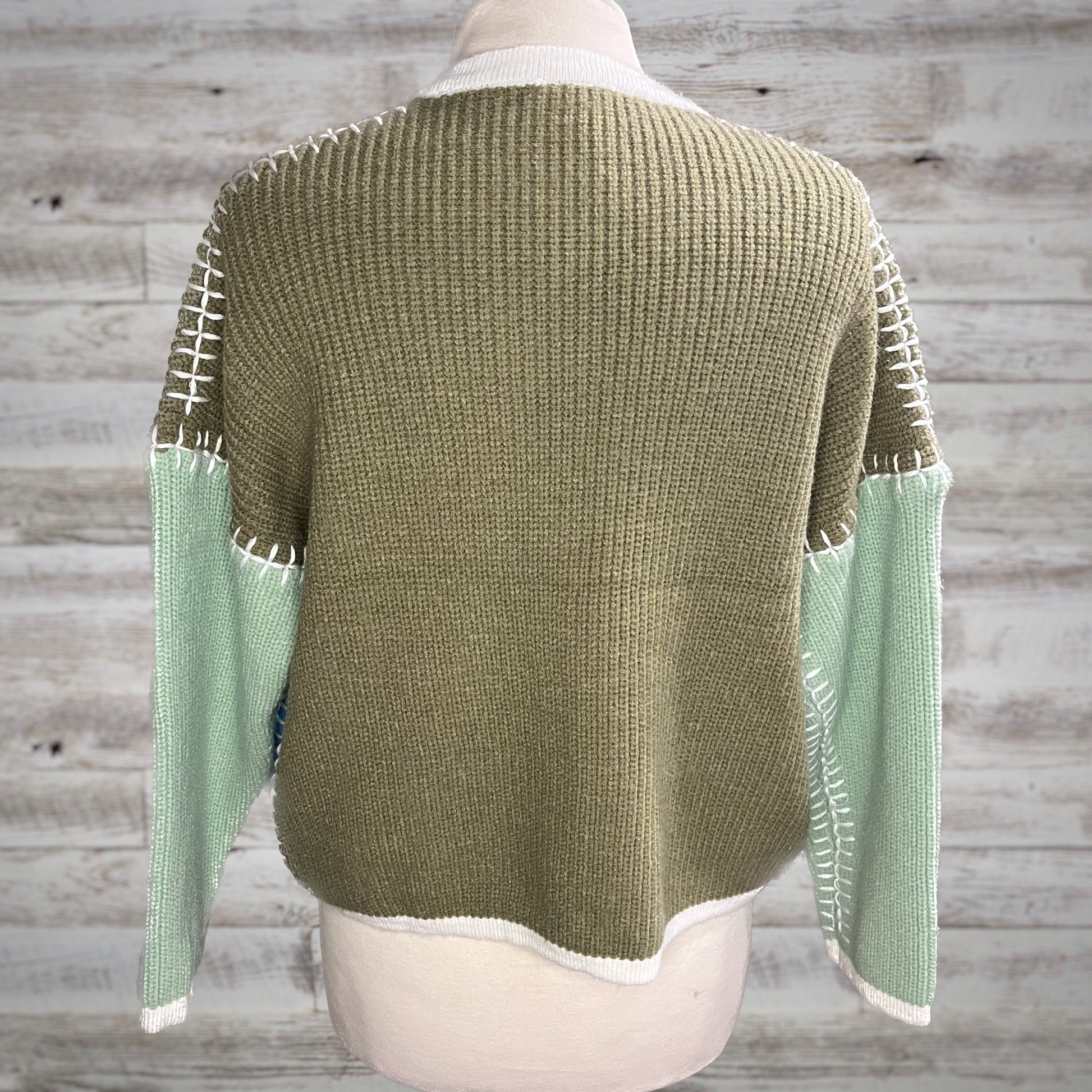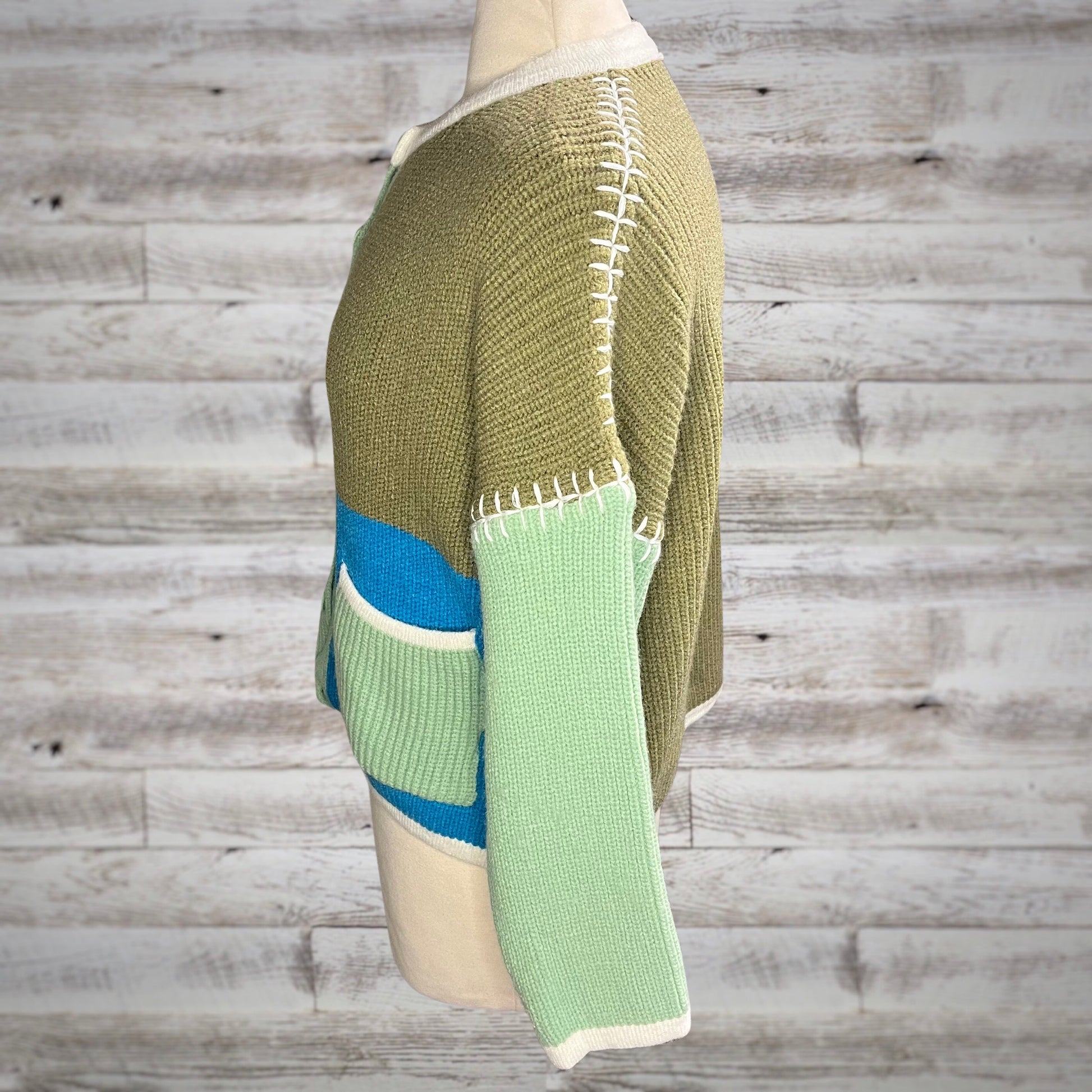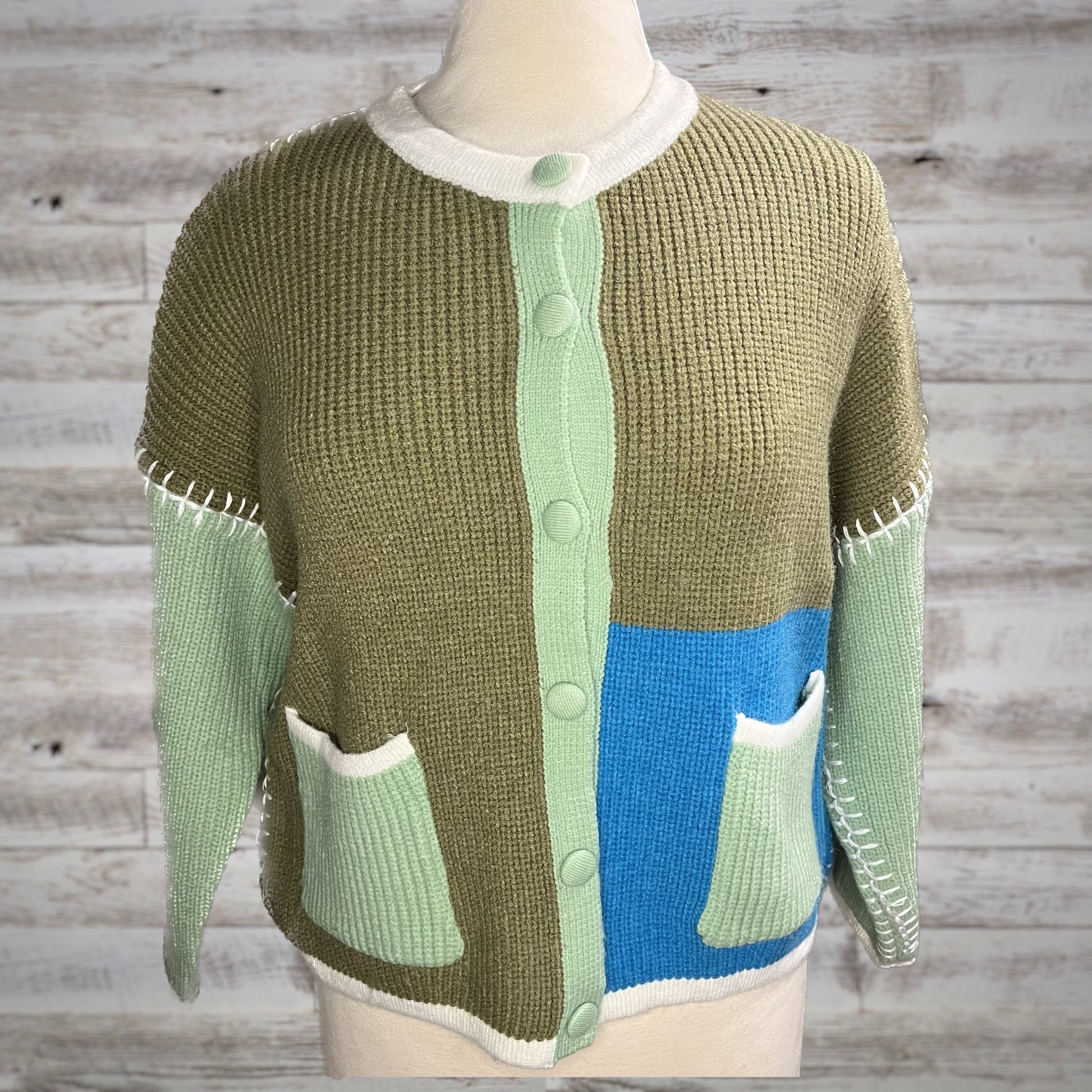 Get ready to stitch up your style with this playful button down cardigan sweater in vibrant green and blue. With a boxy fit and exposed stitching, it's perfect for adding a pop of color and quirkiness to any outfit. Get ready to turn heads and stand out in style!